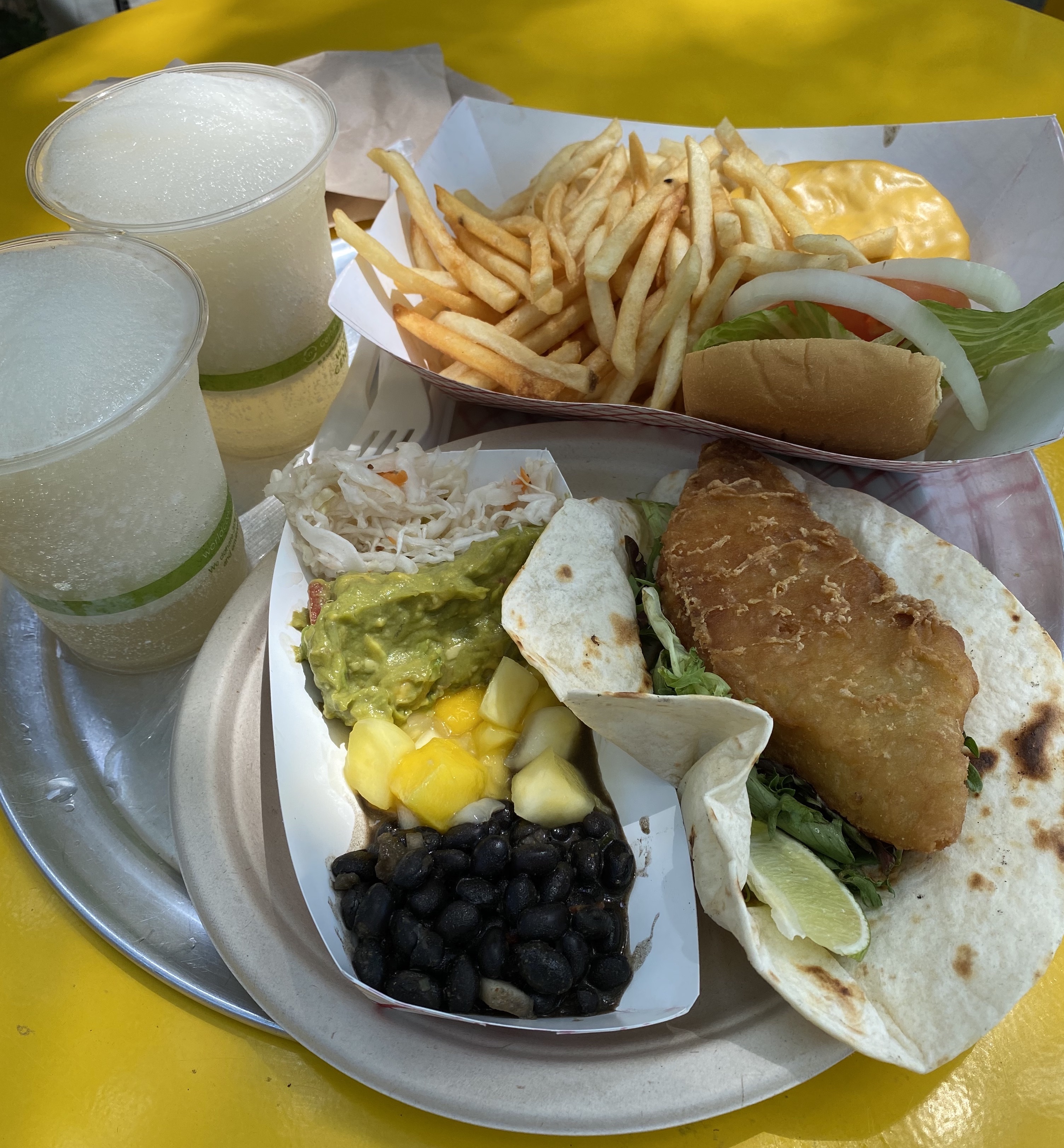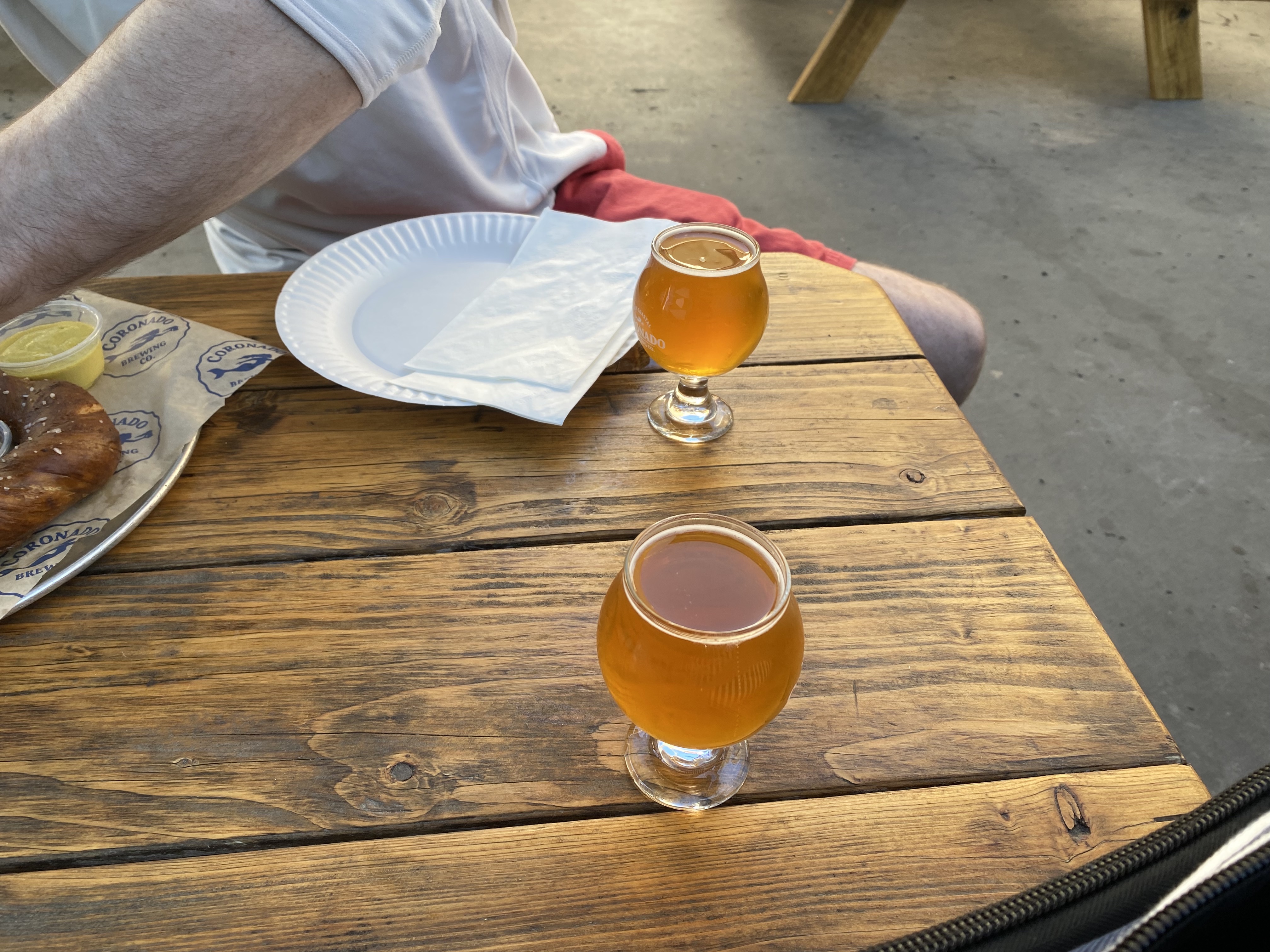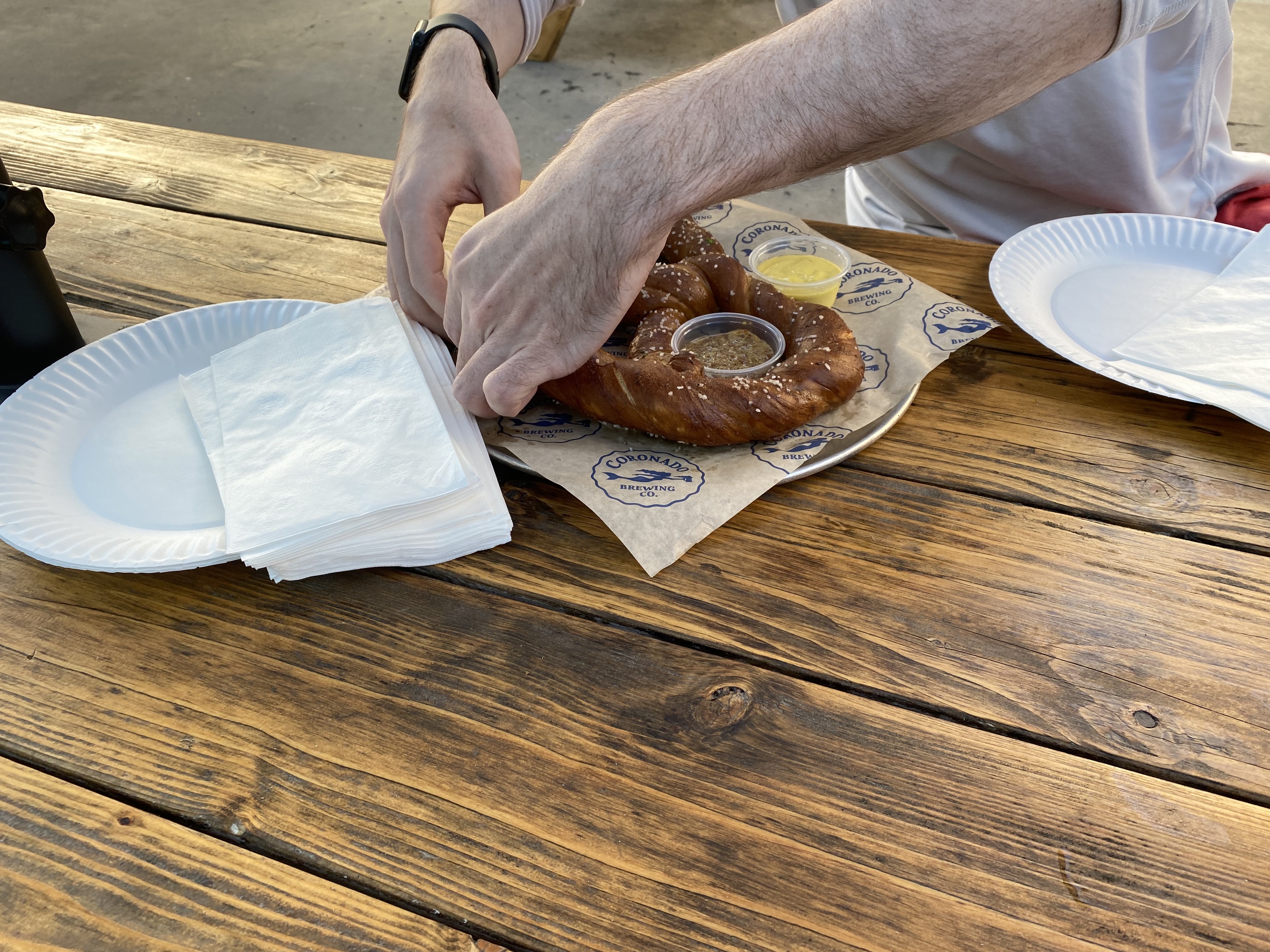 I was chatting with members of the engineering team while we were choosing which of the samples we enjoyed. After our tour at Modern Times, we headed to Coronado. I was so happy to see food at Coronado because I was a bit hungry (it was around late afternoon and our team had an earlier lunch that day). The weather was nice and we were eating outside in picnic style tables. Here are the pictures from Coronado. You can see my colleague breaking a piece off one of the big pretzels (now I’m kind of craving a pretzel as I’m typing this haha).